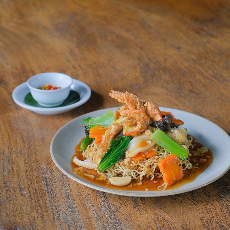 Mie Garing Siram Seafood Crispy noodle with Vegetables and Seafood savory thick sauce on top (Sharing menu) | Rp 126.000 Available - +