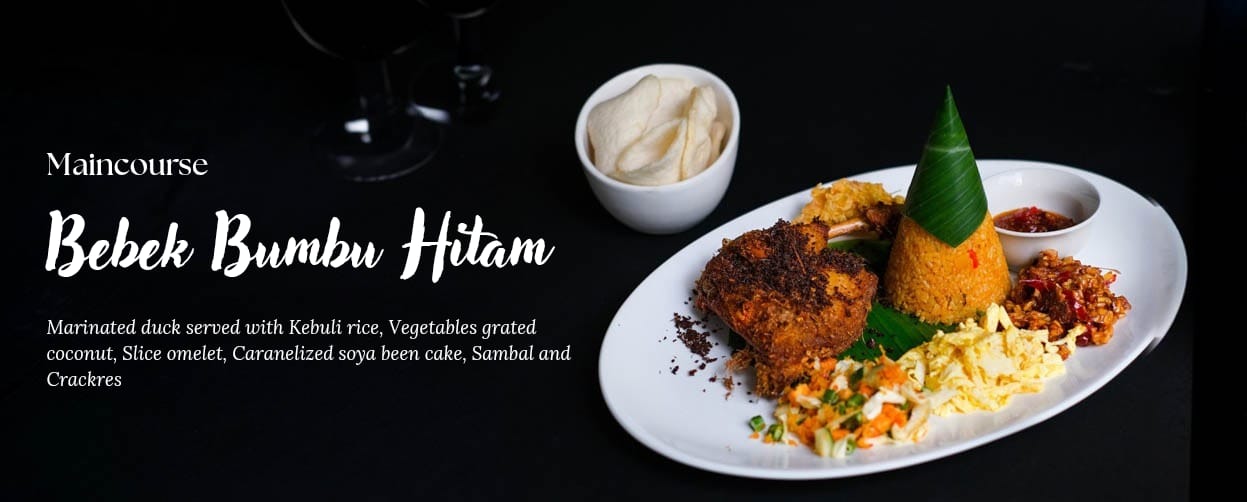 Marinated Duck served with Kebuli Rice, Vegetables Grated Coconut, Slice Omelet Caramelized Soya Bean Cake, Sambal, and Crackers